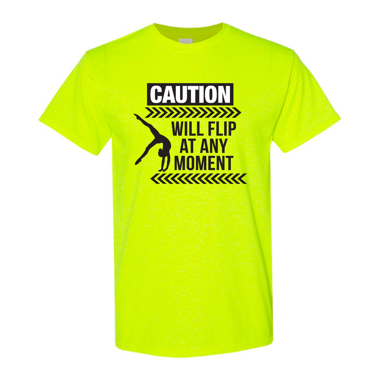 Watch out! Will flip at any moment!! Whether you're a gymnast, a tumbler, or maybe just feeling a little stressed out today, give your friends their fair warning. Safety Green Gildan...